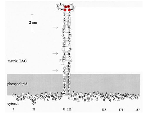 The central hydrophobic stretch of 72 uninterrupted nonpolar residues is the hallmark of an oleosin. No other protein in any organism has such a long, or even half as long, hydrophobic stretch. Proteins on the surface of extracellular or intracellular lipid droplets, such as apolipoproteins, perilipin, adipophilin, and caveolin in mammals, phasin in bacteria and lipid-associated protein (PAP) in plastids, do not have a long hydrophobic stretch [7,8]; their polypeptides run parallel to the surface of rather than penetrate into the lipid droplets. The 72-residue hydrophobic stretch of an oleosin is sufficiently long (a trans-membrane [PL bilayer] peptide has ~20-25 residues) to form a hairpin that penetrates the surface PL monolayer of an OB into the matrix (Figs. 1 and 2). The center of the hydrophobic stretch has 3 proline residues and 1 serine residue that could interact among themselves to form a “proline knot” in a highly hydrophobic environment (Fig. 2). The formation of the proline knot could allow for creation of a hairpin structure of the whole hydrophobic stretch, with two arms of 30 residues each joined by a turn of 12 residues. The 72 residues of the hydrophobic stretch are conserved in terms of hydrophobicity among oleosins of diverse species, and the conservation is higher at the proline knot and its immediate vicinity (-PX5SPX3P-, X being a nonpolar residue). All oleosins contain the 3 proline and 1 serine residues at identical locations in the center of the hydrophobic stretch.