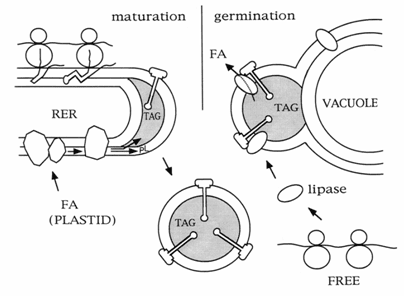 Figure 3. A model of the synthesis and degradation of an oil body in a maize embryo during seed maturation and postgermination. RER, rough endoplasmic reticulum; FA, fatty acid; TAG, triacylglycerols; FREE, free polyribosomes.
