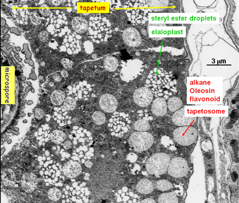 The contents of elaioplasts and tapetosomes are discharged to the anther locule after death of the tapetum cells during the final stage of anther development [20-22]. Steryl esters (but not the enclosing structural protein PAP) of elaioplasts, as well as alkanes, oleosins and flavonoids of the tapetosomes (and possibly self-incompatibility protein factors), are transferred to the pollen surface, forming the bulk of pollen coat.